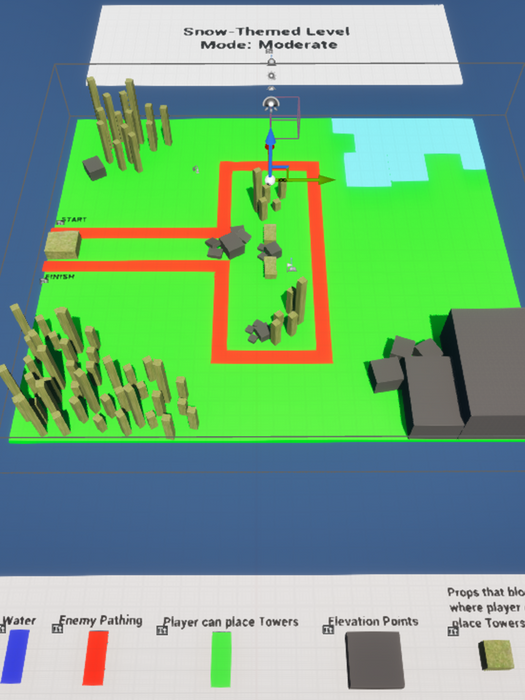 When designing the game’s systems and levels, I focused on clarity and consistency. Enemy paths are clearly defined, tower placement follows a grid-based system, and visual feedback such as range indicators and placement outlines helps players quickly understand what is possible and why. Verticality was also used as a strategic layer, where towers placed on higher ground gained increased effective range, encouraging thoughtful positioning rather than flat, uniform layouts.